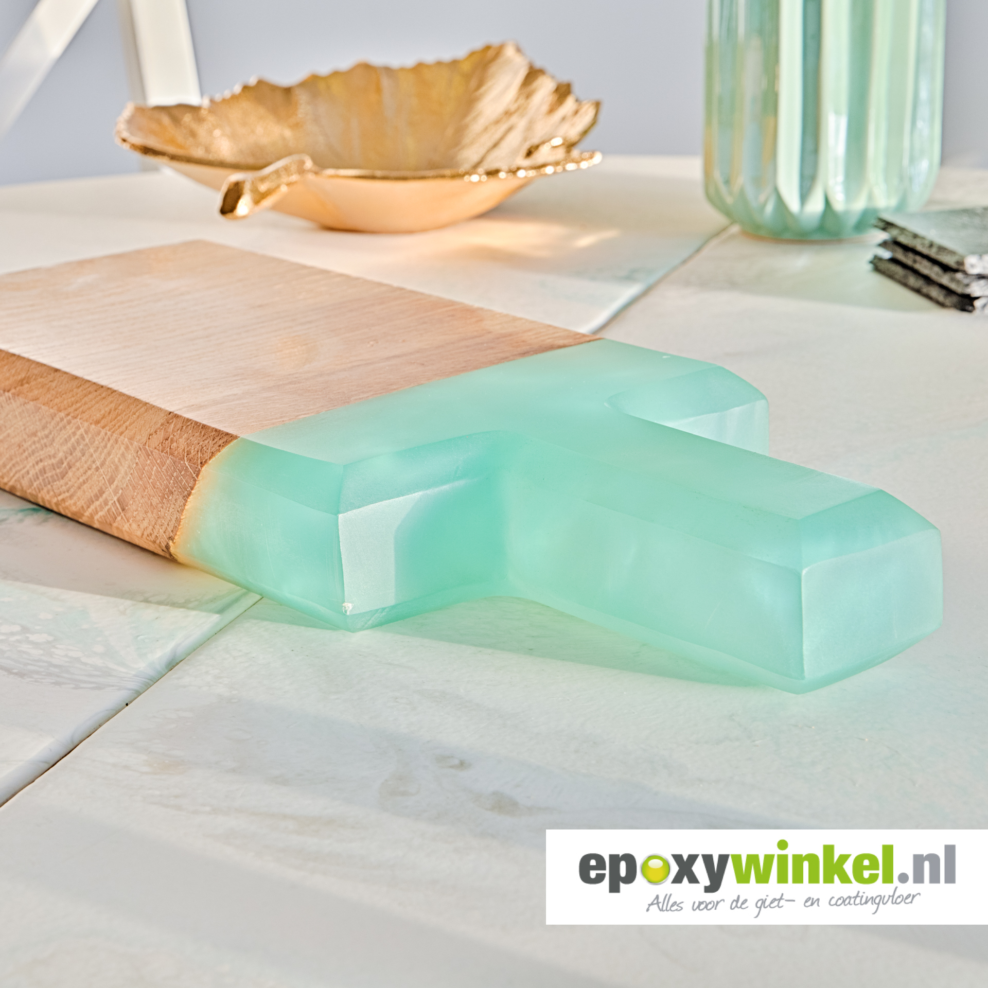 Weet jij al welke kleur jouw serveerplank wordt? Kijk wat mooi past bij jouw houten plank. In ons voorbeeld hebben we gekozen voor het pigment turkooisgroen. Verder heb je Epoxy Giethars UV Traag nodig. We kiezen in dit geval voor de variant Traag, omdat deze epoxy geschikt is voor gietingen van 0,5 tot 4 cm dik.
